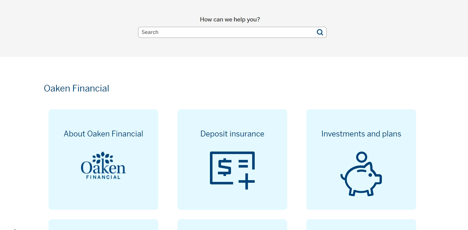 i designed help center divided into two large sections. The Oaken Finanical section would feature six smaller sections about the Oaken brand and general inquiries. The smaller sections for Oaken Financial were already determined by out legacy FAQ page on the website. However, I did review the questions and answers and revised them with up to date content. The Oaken Digital section would feature eight smaller sections about the digital platform such as steps on how to complete a task on Oaken Digital. These smaller sections were taken from our digital banking platform menu. This was the best way to categorize the questions, because of familiarity for the user. When considering the usability heuristic of "Efficiency of Use", using the same terminology in the help center would reduce the amount of time for the user to find the answers to their questions. I also added an addtional section called "Troubleshooting" for anticipated questions about device compatibility.